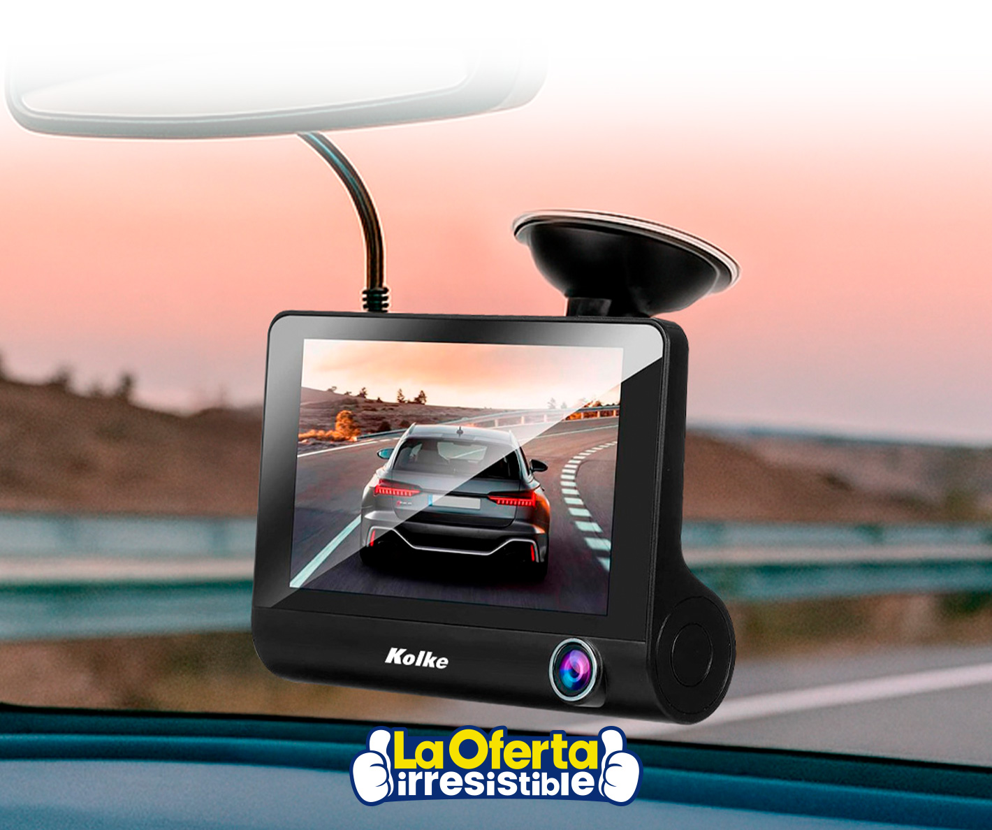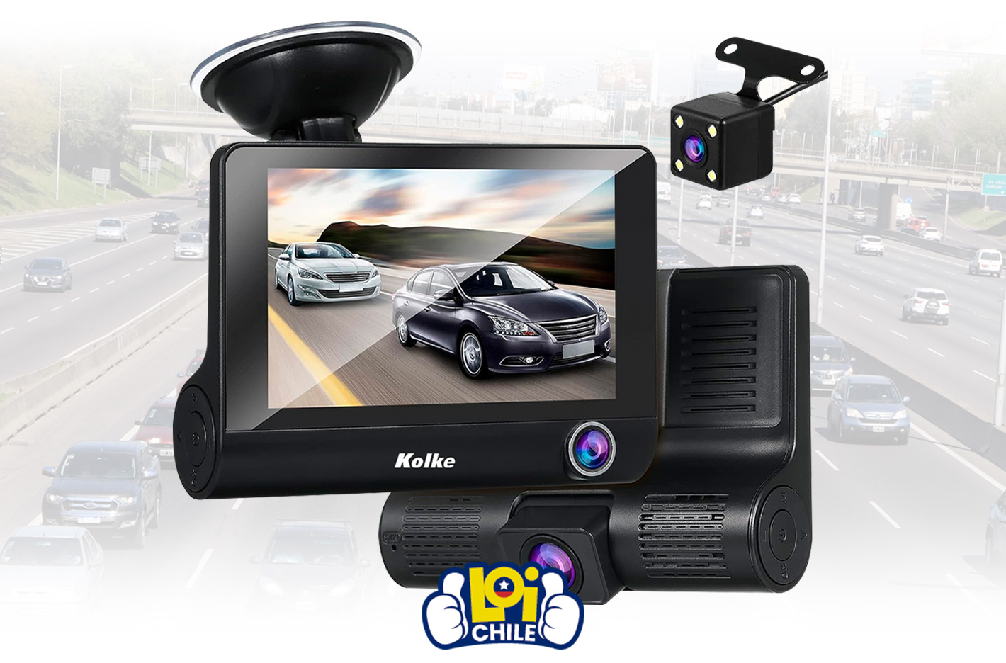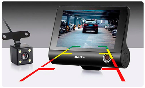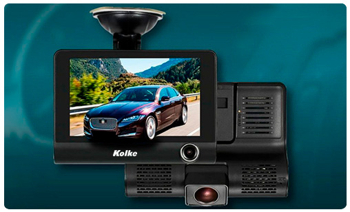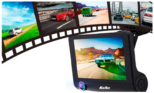 Triple Cámara para Auto KOLKE, Gran Angular 170º Frontal, Interior y Reversa + Pantalla IPS de 4.0” Batería Recargable