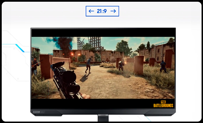 - Mantente a un paso de la victoria. Ajusta tu pantalla a 21:9 para descubrir áreas ocultas en las escenas del juego con la Vista de juego ultraancha. Ahora, cuando quieras disfrutar de un juego de fútbol, verás absolutamente todo de la cancha, incluso los postes. Y en los juegos de conducción, tendrás una vista natural y envolvente del camino.