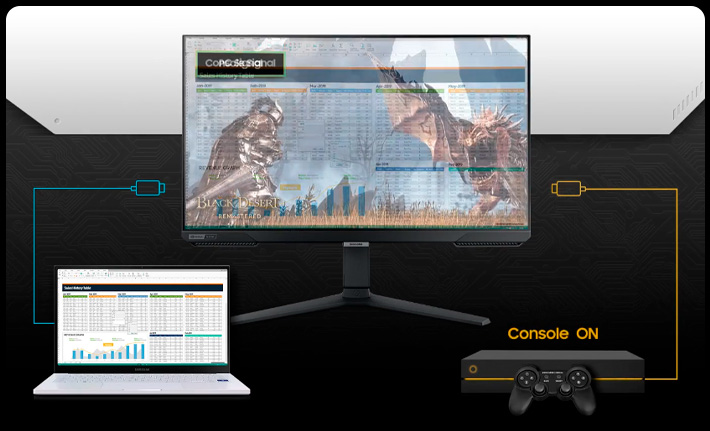 Enciende para jugar al instante. Con Auto Source Switch+, tu monitor detecta cuando los dispositivos conectados están encendidos y cambia instantáneamente a la nueva señal fuente. Esto te ayuda a llegar a la acción de tu juego más rápido sin pasar por múltiples fuentes de entrada.