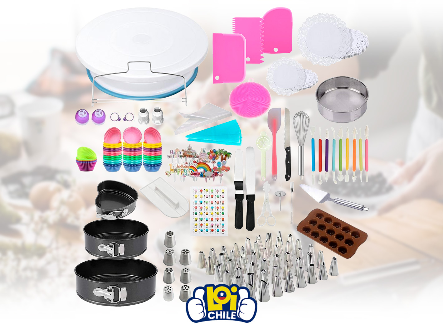 Este set de repostería de 512 piezas es el complemento ideal para cualquier amante de la pastelería, ya sea principiante o profesional. Incluye una amplia variedad de herramientas como mangas pasteleras, clavos de flores, espátulas, plato giratorio, moldes para torta y más, que te permitiran explorar tu creatividad y decorar postres, pasteles, cupcakes, galletas y mucho más.