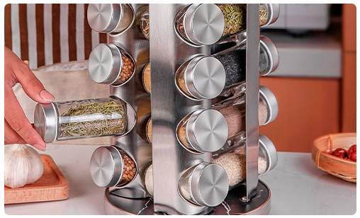 El Set de 20 Especieros CROiX giratorio en acero inoxidable y frascos de vidrio es el complemento perfecto para tu cocina. Tiene un diseño elegante y una base giratoria de 360° que te permite acceder de manera rápida a tus condimentos favoritos. Además, gracias a que los frascos cuentan con tapas de rosca, aseguran la frescura de tus especias y hierbas, facilitando su uso y almacenamiento.