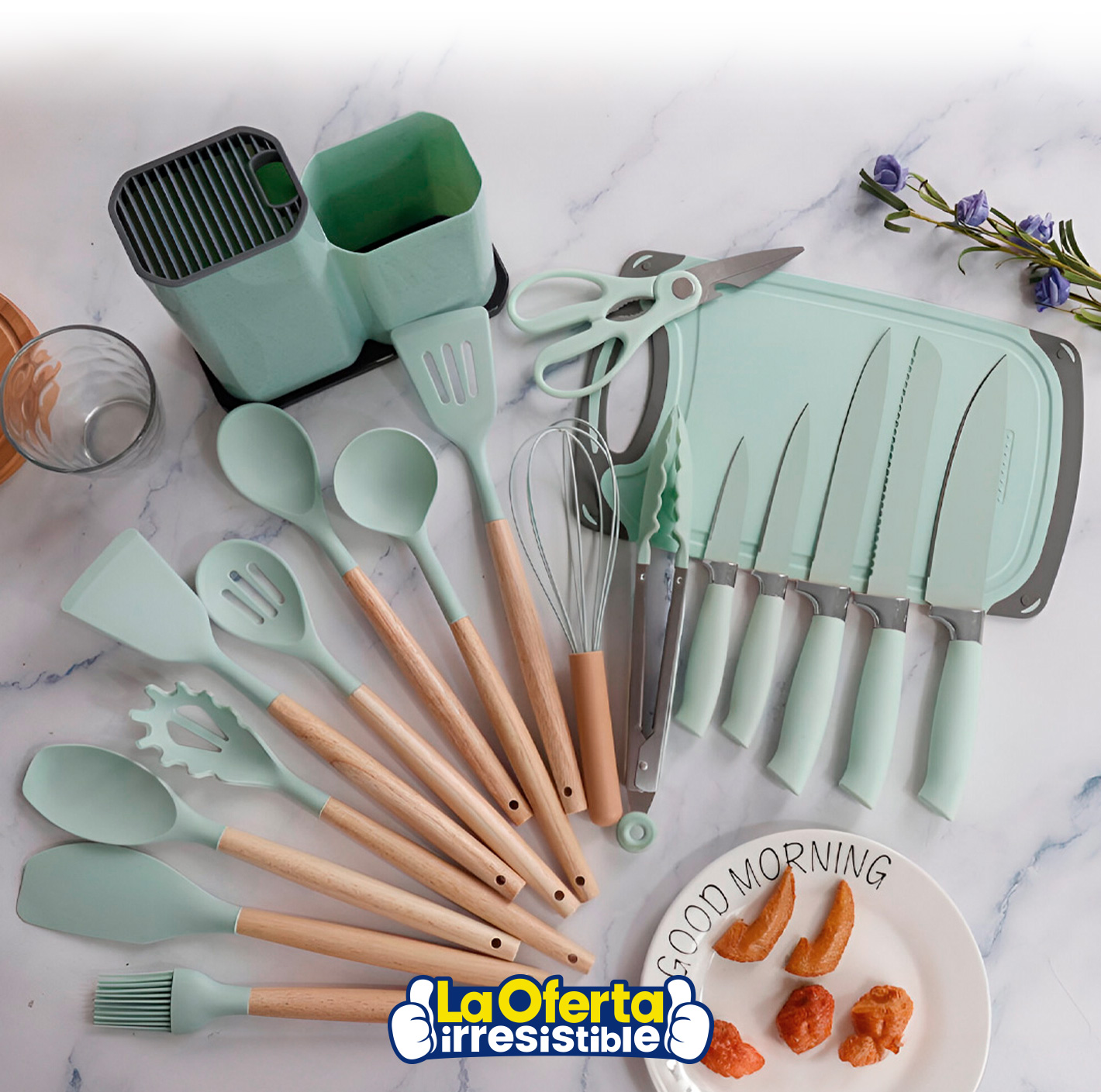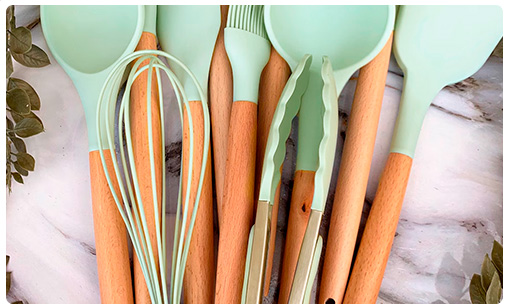 Set de Cocina CROiX 19 Piezas con Juego de Menage de Madera y Silicona, Set de Cuchillos, Tabla de Picar y Soporte de Almacenamiento - Verde